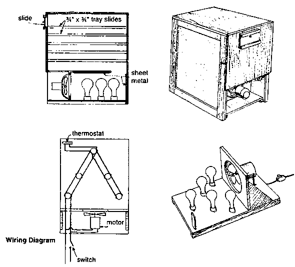 A simple electric dehydrator can be constructed using plywood, sheet metal a small fan, five household lightbulbs with porcelain mounting fixtures and some screening material. The drier shown below is 32 inches long by 21 inches wide and 30 inches high, and contains racks for five trays. The fan and the sheet metal lining the bottom compartment help conduct heat upward through the box.