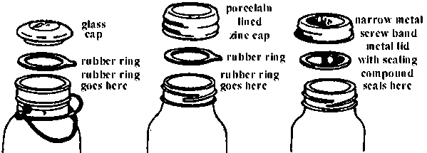There are three types of glass canning jars used for processing horticultural crops. The ball type jar and the zinc capped jar both require rubber rings as seals. These can sometimes be difficult to obtain, but if locally available, make excellent containers. Currently the canning jar with a two-pieced lid is the most commonly used container.