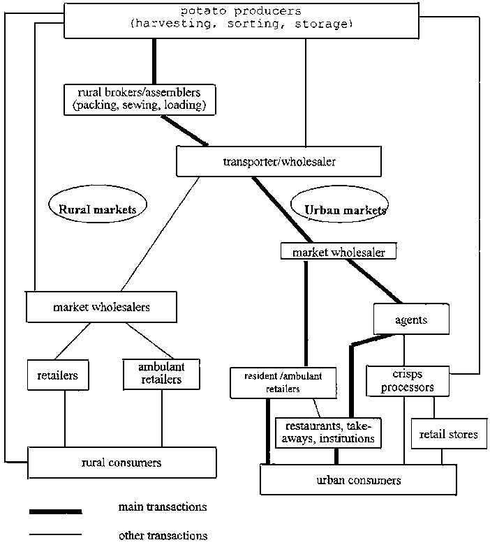 Figure 2 shows the market chain from farmer to retailer. The major marketing channel is through traders to Nairobi and other major towns. Figure 2 and Figure 3 show the actors, but they do not indicate the options/decisions at different levels in view of constraints within the chains. This is bound to have implications for such pertinent issues such as financing which in this case has been missed out. More work is required in this area; and also to examine questions such as (i) which actors have been left out? (ii) what possible aspects have been overlooked? (iii) did farmers show any preference in their allocative decisions in assigning potato to poorer or better land? e.t.c.