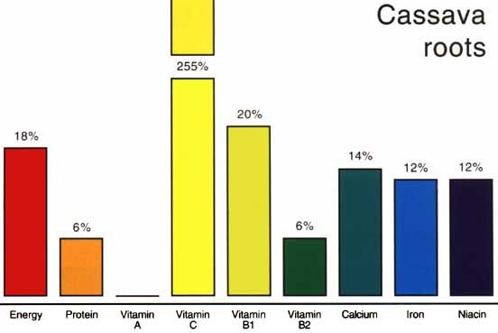 The cassava root is not as nutritious as taro yam, sweet potato, bananas or breadfruit, but it does have some nutritional value. It contains a lot of carbohydrate which can provide the body with energy. It is a good source of Vitamin C, potassium and dietary fibre. The body needs energy for warmth, work and play. Vitamin C keeps body tissues strong, helps the body use iron, and helps wounds heal and fights infections. Potassium helps in maintaining a good balance of bodily fluids in the blood. Dietary fibre prevents constipation by helping the body to have regular bowel movements. It also tends to lower cholesterol levels in the blood and helps prevent heart diseases.