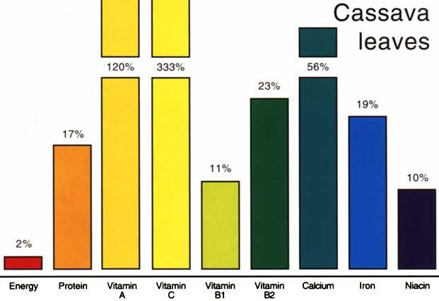 A very nutritious addition to cassava root at meal times is cassava leaves. As the bar charts show, cassava leaves provide high amounts of Vitamin A and Vitamin C. Half a cup of cooked cassava leaves would provide half of the daily Vitamin A needs of a young child. Vitamin A is needed for proper growth, healthy eyes and protection from disease. People should be encouraged to use this valuable food whenever it is available. Cassava leaves also have a fair amount of dietary fibre.