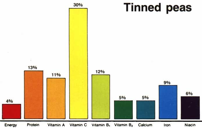 Looking at the bar graphs it is easy to see that pumpkin leaves have more food value than tinned peas. Pumpkin leaves have much more Vitamin A and Vitamin C. Tinned peas are much more expensive than pumpkin leaves and have to be imported. Eating vegetables grown near the home is healthier and will save you money.