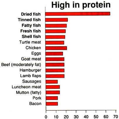 The bar chart shows that fish is a very good source of protein. Compared to mutton, pork, bacon and sausages, fish is the best source of body-building food.