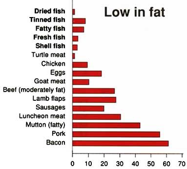 Most fish contain very low amounts of fats and oils. The oil in fish is special. It is mostly of a type that can keep the blood vessels in the body healthy. This helps prevent high blood pressure and heart attacks. From the bar chart on fat content, we can see that fish is an excellent body-building food both for children and for those who want to lose weight. Compared to sausages, mutton, lamb flaps, beef, pork and bacon, fish is generally low in fat.