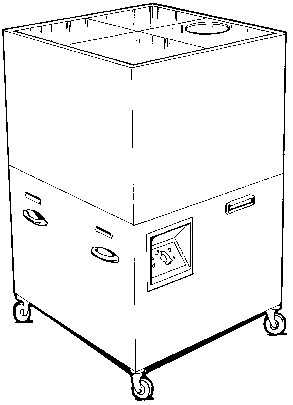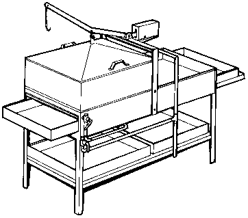 The trays are placed in the blanching compartment, where the food is blanched by steam and then passed automatically to the cooling compartment. Scale is 1.8 x 0.8 x 1.2m.