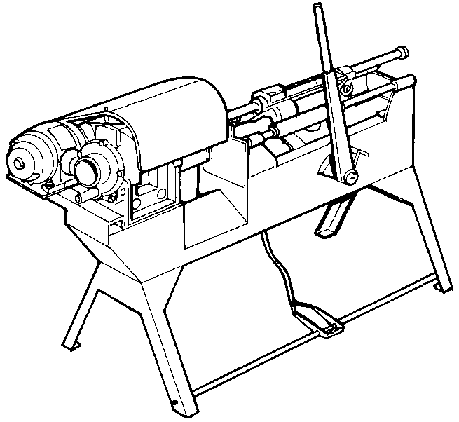 Pineapples can be peeled and cored in the following way. The pineapple is trimmed at both ends and placed into a V-shaped spring-loaded trough as the operator centres the coring tubes. The pineapple is held with the left hand and the manual lever is moved until the coring tube has pierced the fruit. The foot pedal is depressed which raises the stop bar holding the fruit in a coring position. Throughput: 600-720 operations per hour.