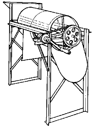 This prototype model uses a centrifugal blower fan to separate the grain from the chaff. The improved model works at about 99% winnowing efficiency. An integral motor is included and the machine is freestanding. Throughput: 466kg per hour.
