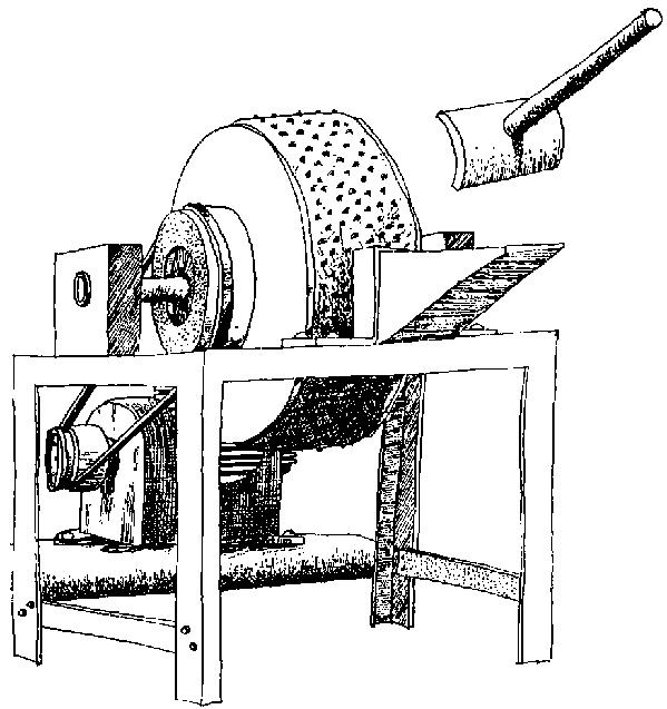 Sometimes a group of processors will purchase their own mechanically powered rasping or grating machine or a private contractor will travel within a group of villages grating cassava for a fee. There are two types in common use: i) modified hammer mills and ii) graters using an abrasive disc. The abrasive surface can be either cylindrical or a flat disc (figure 5.5) and is frequently a galvanized metal sheet with nail-punched holes, as in the hand grater, and attached to a wooden frame. It is said the grating surface normally wears out with six months of regular use and must be replaced otherwise the output of the machine is significantly reduced. One further disadvantage with this rudimentary grating surface is the difficulty of cleaning it after use. Debris becomes lodged in the holes and within the torn flanges and becomes a substrate for microbial growth and the possible subsequent contamination of the grated cassava which could affect the subsequent fermentation.