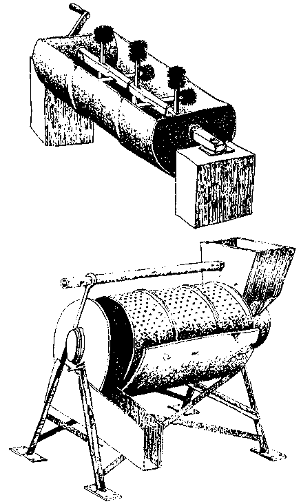 CIP has developed simple processing machinery for the production of dehydrated potatoes, including a washer, peeler, slicer and dryer. The peeler is a metallic cylinder rotating on a horizontal axis. The cylinder is punched from the outside at about 7 mm centres leaving jagged raised flanges inside creating a rough abrasive surface. The cylinder is loaded with potatoes and rotated at about 60 revolutions per minute and the rough internal surface effectively scrapes the peel from the potatoes (Figures 5.12). Water is fed into the cylinder to wash out the peelings. The peeler can be turned by hand or a small motor. A batch of 20 kg takes about 20 minutes.