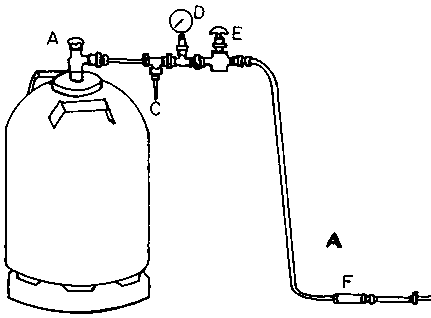 Cylinders may have a single outlet closed by a wheel valve (A in figure la), with a dip tube to the bottom of the cylinder, or two outlets (figure 1b), of which one outlet has no dip tube and is used for pressurization of the cylinder. The other outlet is for delivery, has a key valve, B, and a dip tube to the bottom of the cylinder. As shown in figure 3.2, the cylinders need a delivery fitting that incorporates a Schrader valve, C, a gauge, D, a wheel valve, E, additional to the wheel or key valve on the cylinder, and a filter, F. The filter contains glass wool to prevent dirt and rust from getting to the nozzles. The size of the connecting joint varies with the manufacturer and the fitting must have an adapter suitable for the cylinder (some cylinders have a 3/8 inch (1 cm) male thread.) However, apart from the special connection to the cylinder, the rest of the line couplings should he a standard 10 mm.