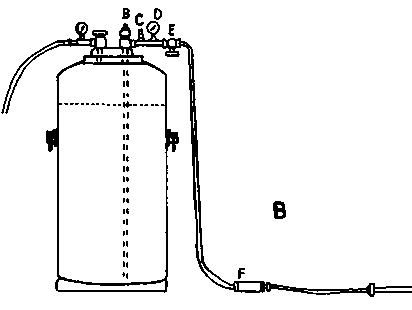 When the gas tightness is satisfactory, the required dose should be applied. After closing valve A or B, the lines should be cleared by applying compressed air through the side valve, C, and the cylinder should then be disconnected.