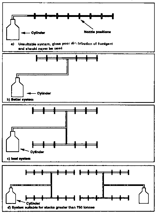 The design of piping systems should he branched, so that fumigant is distributed from the centre of the system, and provides equal pressure and gas discharge at each outlet. The number of outlets required is dependent on the size of stack to he fumigated hut as a general rule one nozzle is allowed for every 8 square metres. For a stack comprising 100-200 tonnes of maize, two outlets are usually sufficient. A 500-tonne stack will require about eight outlets. The smallest piping system should he T-shaped, and larger systems are conveniently designed in an H-arrangement with an equal number of outlets in each arm. No more than six outlets should he used for one arm of an H-arrangement. For very large stacks, (eg, those of more than 750 tonnes), fumigant is best applied at more than one point, into separately laid piping systems. Very long, un-branched piping systems should not be used, since these will result in uneven distribution of methyl bromide, most of which will be discharged from outlets nearest to the cylinder. Weighing scales are essential for the accurate metering of fumigant into stacks, and should preferably he of the platform type.