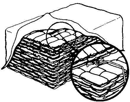 14. Sheets must he sealed to the floor with sand snakes of a suitable weight and width to give at least 15 cm. ground contact. The ends of each sandsnake must overlap when laid in position. A double row should be used on each corner of the stack.