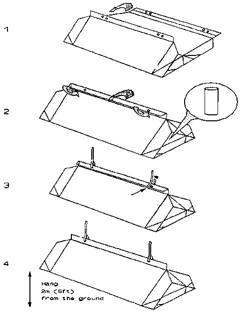 5.2.2. If very short trap exposures are planned, say one or two days, the traps can be inverted so that their sticky surfaces face outwards; this results in higher catches. However exposures of longer than two days result in the glue becoming inoperative due to dust, insect bodies or rain.