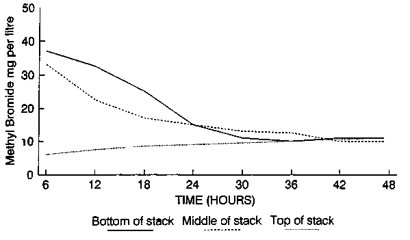 Gas concentrations in mg/l recorded during fumigation of 130 tonnes maize using methyl bromide at 32 g/m3