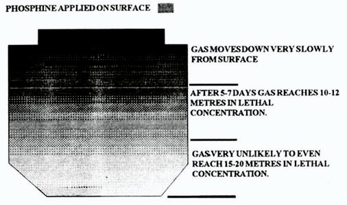 It is therefore apparent that there are major advantages in prolonged exposure periods. This allows time for insect development to proceed to more susceptible stages which are subsequently controlled at a much lower dosage. This approach also allows sufficient time for the phosphide formulation to completely decompose, and time for the gas to be distributed via natural convection currents. However, it is implicit in the use of longer exposure periods that the standard of gastightness is sufficient to permit the retention of an adequate concentration, for the required time.