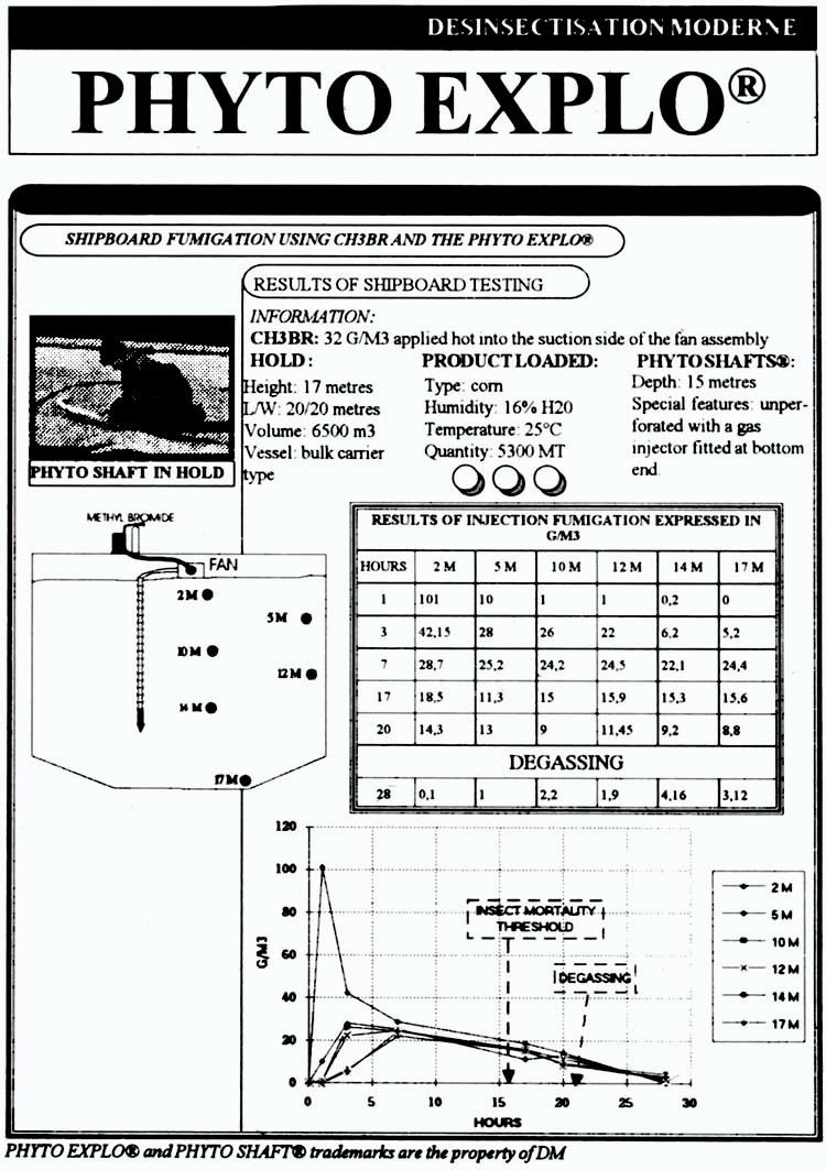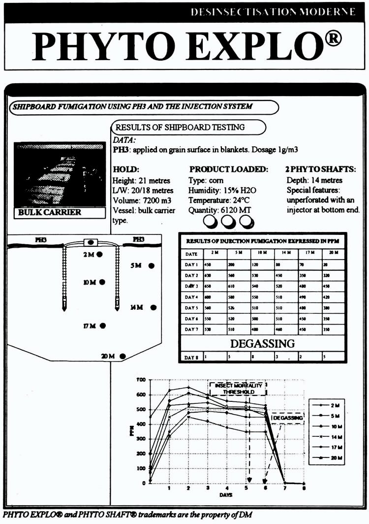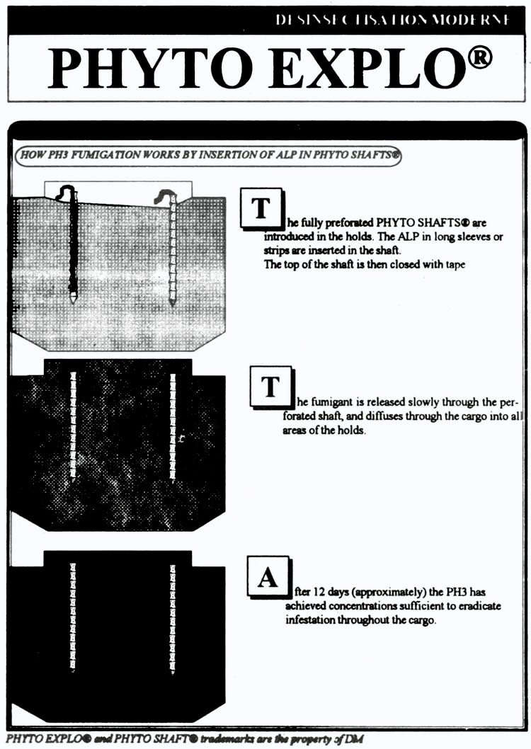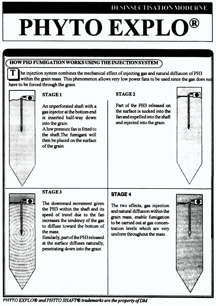 Another method of dosing developed by "Désinsectisation Moderne" for use in deeper grain bulks, is the Phyto-Explo® System, a patented method for the introduction and distribution of phosphine or methyl bromide in bulk cereals, without the need for a pre-positioned piping system.