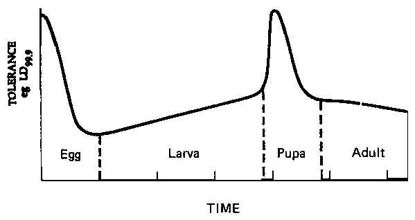 Fig 15.1. Schematic representation of changes in tolerance to phosphine of the different stages of stored product insects with time (Source: WINKS, 1986)