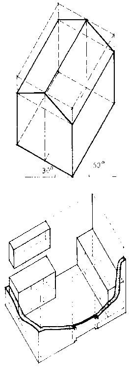 In axonometric projection the plan view of the building is placed on the drawing table with its side inclined from the horizontal at any angle. Usually 30°, 45° or 60° is chosen since those are the angles of the set squares. All vertical lines of the building remain vertical and are drawn to the scale of the plan view.