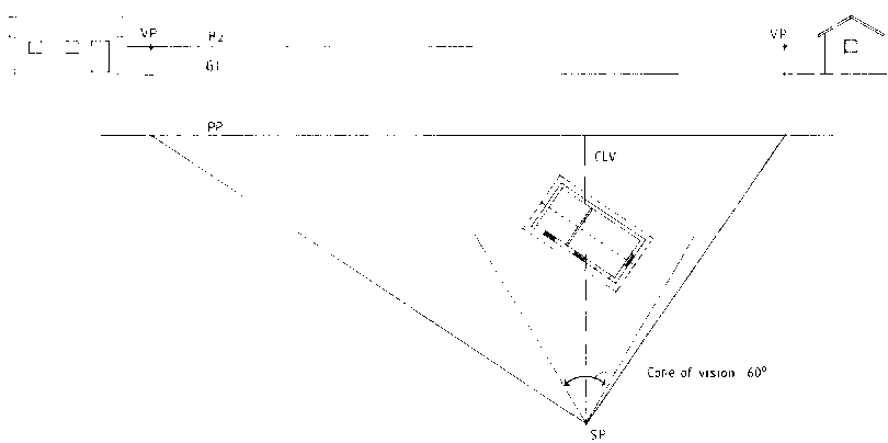 Next draw a centre line of vision i.e., a line from the station point to the building. Fix the drawing on the drawing board with the centre line of vision (CLV) in a vertical position and cover with a transparent paper. Check that the building is falling within a 60° cone of vision, since parts of it falling outside this cone will appear distorted when looking at the picture.