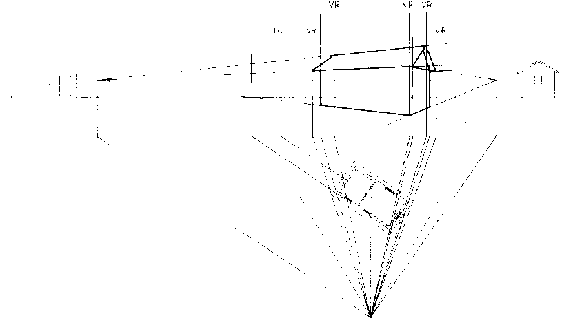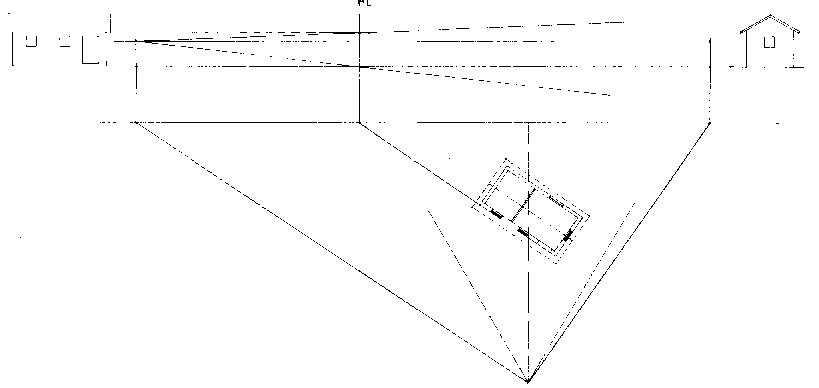 Since the technique with a window pane obviously can not be used for a proposed but still non-existing building, the perspective has to be constructed from available documentation. A perspective drawing of a building can be constructed using the plan view or, if several buildings are to be included, the site plan would be more suitable. In addition one would require elevations of all visual sides of the building(s) i.e., in the case of one building the front elevation and one end elevation.