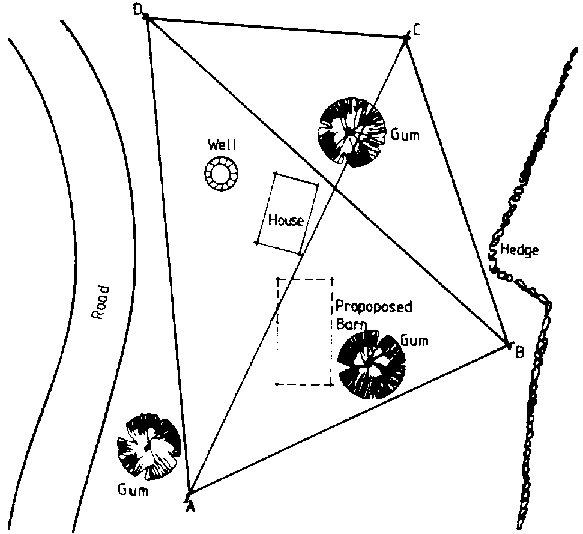 Not all details are measured by perpendicular offsets. Sometimes it is more accurate and convenient to use pairs of inclined offsets which together with a portion of the chain form acute-angled triangles. Note the top corner of the house in Figure. 2.7b.