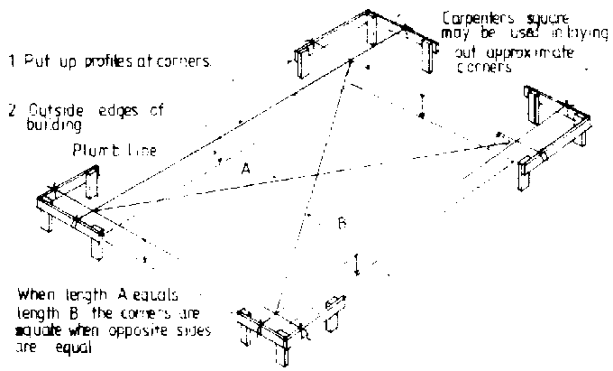 Check again on the accuracy of the setting out by measuring the diagonals of the rectangle. For buildings having sides from 5 to 20m long, the length of the diagonals A and B in Figure 2.9 should not differ more than 0.5%. If adjustments are necessary following this check, it is advisable to keep the two longest parallel sides fixed and to make the required adjustments on the short sides.
