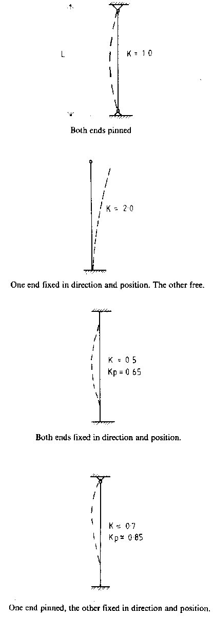 The consideration of the two end conditions together results in the following theoretical values for the effective length factor. (Kp = factor usually used in practice).