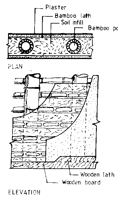 The supporting structure should be generously designed of preservative - treated or termite-resistant timber of poles, and inspected and maintained periodically, as a sudden collapse of this heavy structure could cause great harm. The durability of the mud cover can be improved by stabilizing the top soil with cement, and it can be waterproofed by placing a plastic sheet under the soil. Figure 5.38 and Figure 5.39 shows two types of earth roofs.