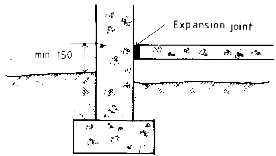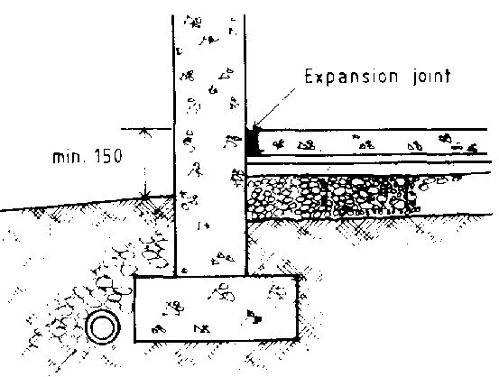 Solid concrete floors should be laid on a level and tampered base of hardcore or gravel. On well drained sites also sand or even laterite can be satisfactory. The base layer should be at least 100mm thick. While it is desirable for the finished floor level to be at least 150mm above the surrounding ground, some fill may be required under the base course. However, fill need to be thouroughly compacted to get the required stability and, generally, it is therefore more satisfactory to increase the thickness of the base course. Any material used for fill or for the base course must be free of organic matter. hence, the excavated top soil must be rejected as fill. If a damp-proof barrier (polythene or a 3mm thick hot bitumen layer) is to be installed, a layer of sand should be spread over the base. Sand can also be used as blinding on a hardcore base to reduce the amount of concrete that 'disappears' in the gaps between the stones. Finally, 75 to 150mm timber screeds are put in place to be used as guides in striking off and leveling the concrete and reinforcement bars, if advocated, are put in position. The thickness of the slab will depend on the expected loads, the quality of concrete used, reinforcement and the bearing characteristics of the ground.