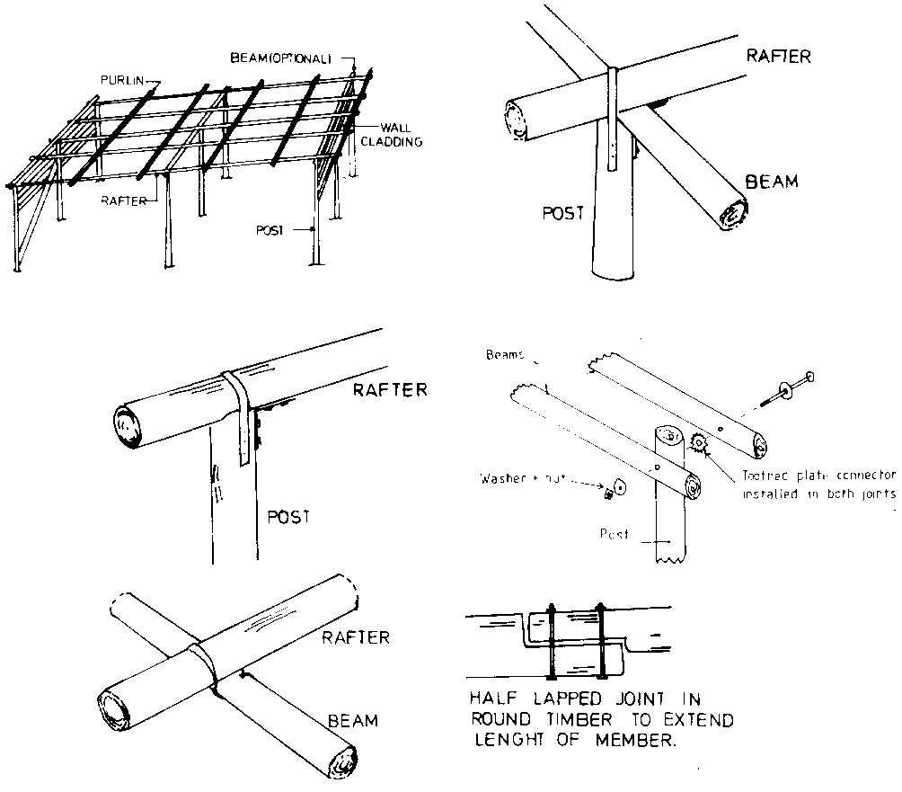 For stores or other buildings where tractors and lorries may be driven inside, considerable free height is necessary. Rigid frame structures are well suited for this purpose. A simple frame can be built of gumpoles or sawn timber connected with bolts as shown in Figure 5.45.