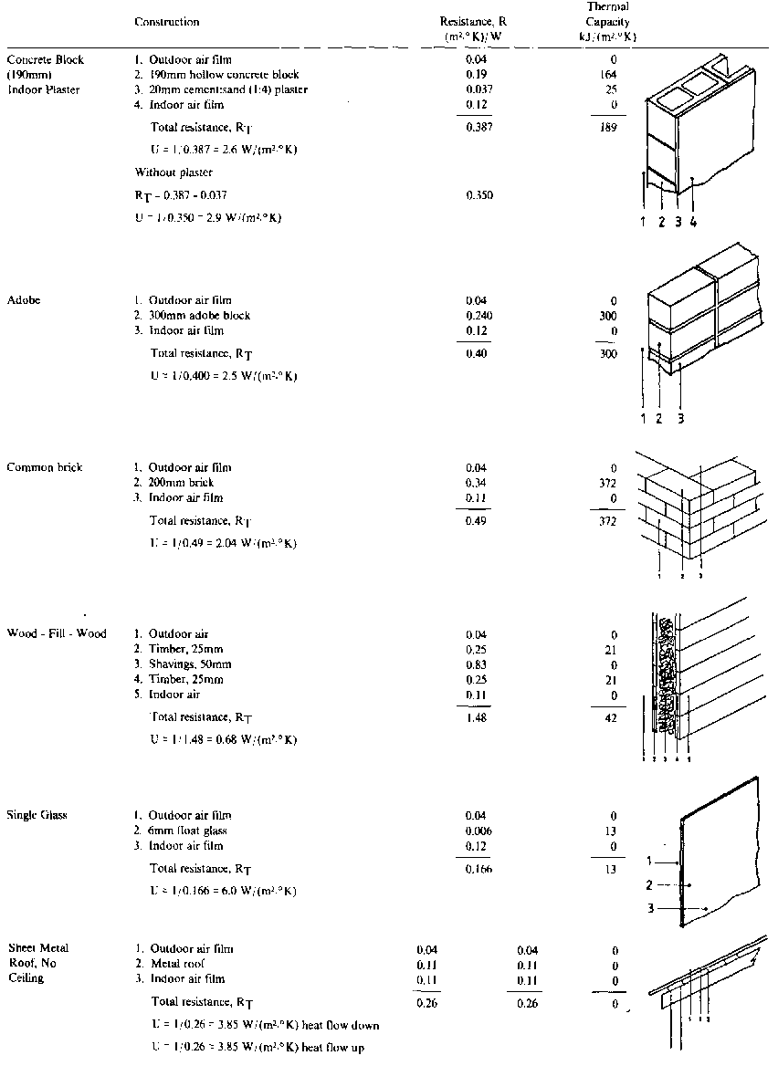 Using values from Tables 7.1 and 7.2 overall heat transfer coefficients (U) have been calculated for a number of composite wall and roof constructions. Although estimates were necessary for some materials, the U values are realistic. Table 7.3 shows several of the construction units.