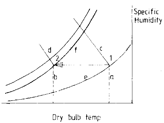 Evaporating moisture from a to b cools the air from c to d. As 1 and 2 are on the same enthalpy line, the process is adiabatic (no change in heat) the relative humidity rises from 1 to 2.