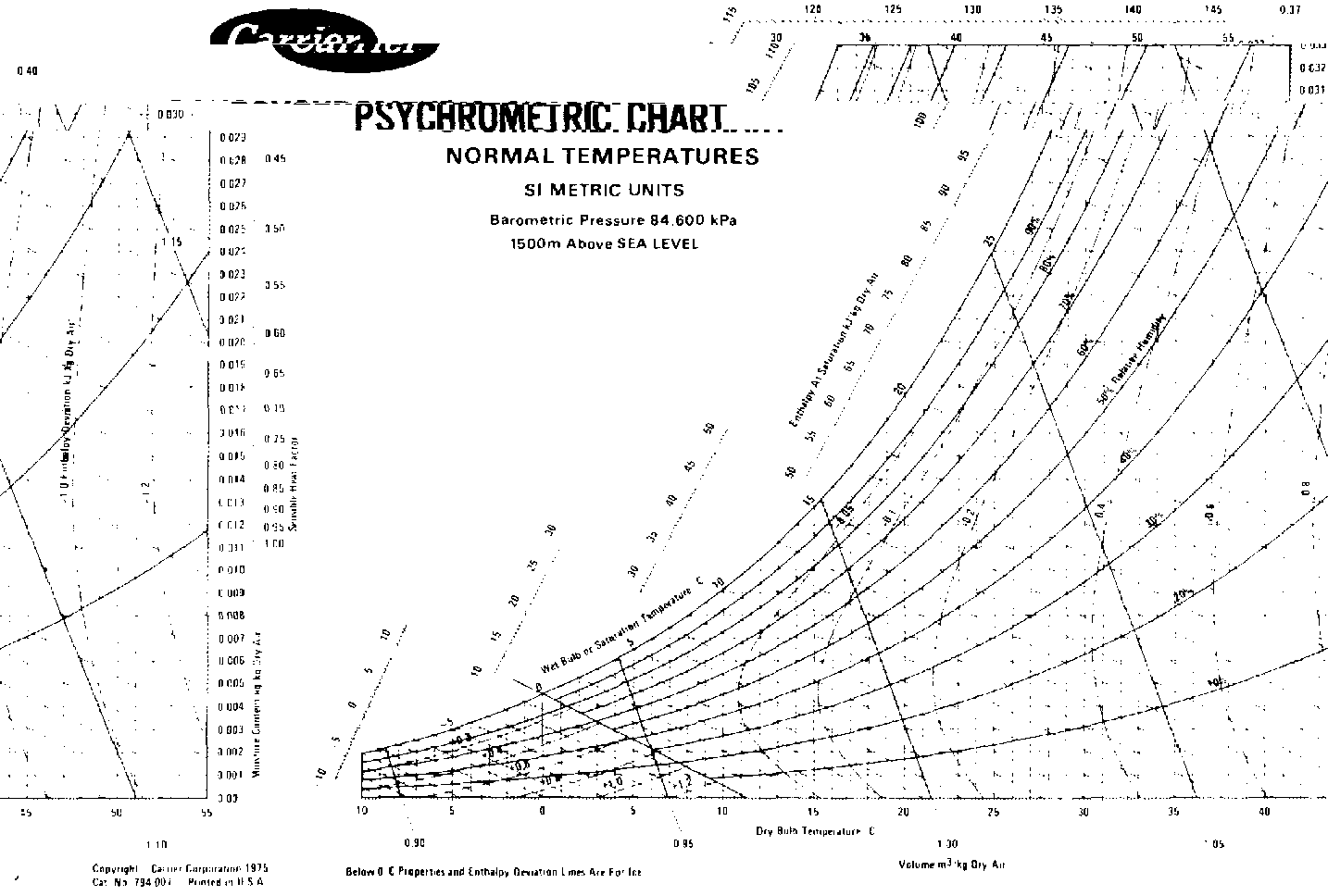 The intersection of any two property lines establishes a given state, and all other properties can be read from that point. The changes that take place between any two points are of particular use. The vertical lines show dry-bulb temperatures; the curved lines, relative humidity; the slant lines, wet bulb temperatures and enthalpy; the horizontal lines, dew point temperatures and specific humidity, and the steep slant lines, specific and humid volume.
