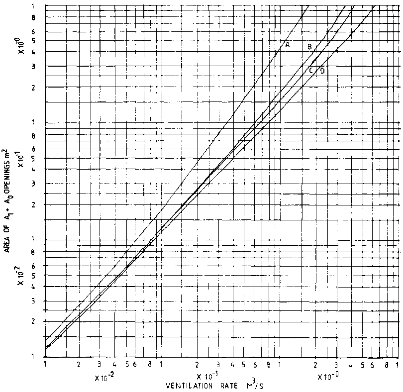 To determine the inlet and outlet areas required to provide a given ventilation rate by thermal convection, the following equation based on stack effect theory can be used: