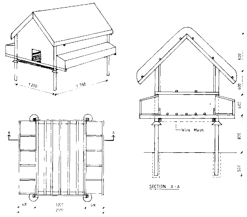 Figure 10.38 shows another type of shelter for roosting and laying, which can be used in combination with daytime foraging by the hens. The legs of this structure have rat guards and ant protection and may be equipped with skids or wheels to make the whole unit easily movable between runs. Feed and water are provided in troughs outside the house.