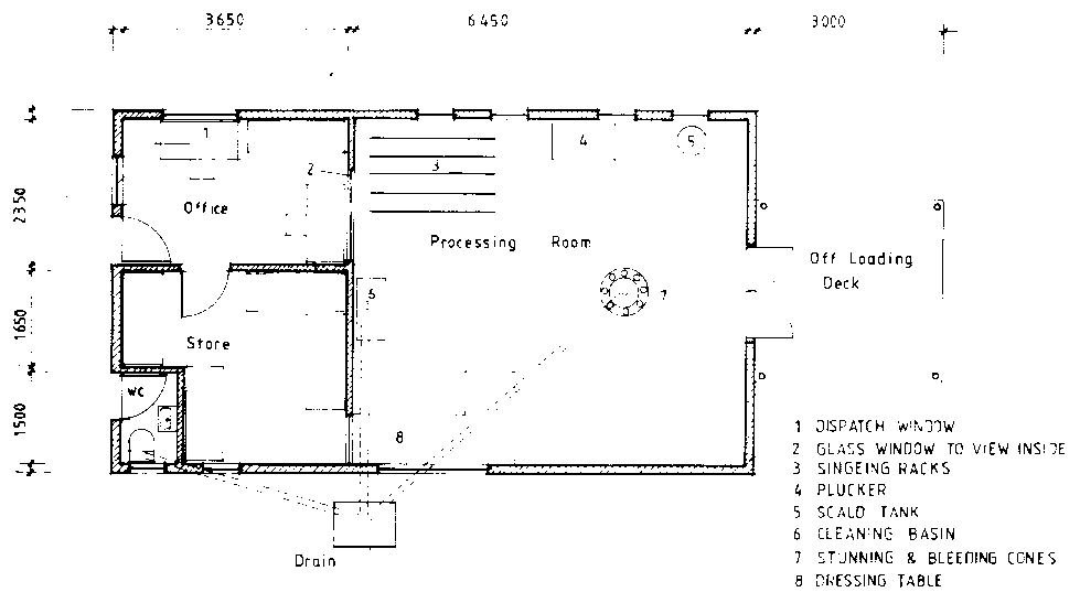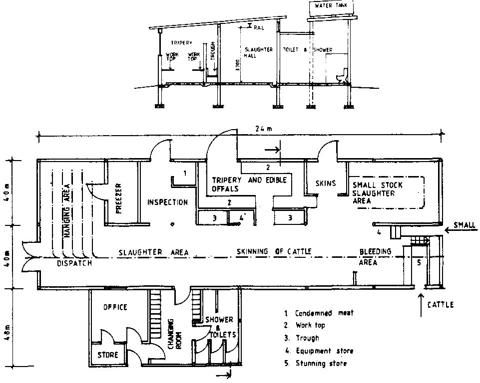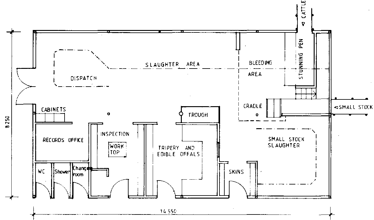 Satisfactory waste disposal is a requirement from the start. The slab can be surrounded by wall 1.5m high and partitions can be installed between clean and dirty operations areas. A lairage should be constructed for both cattle and small animals. Drinking water should be available for the animals at all times.