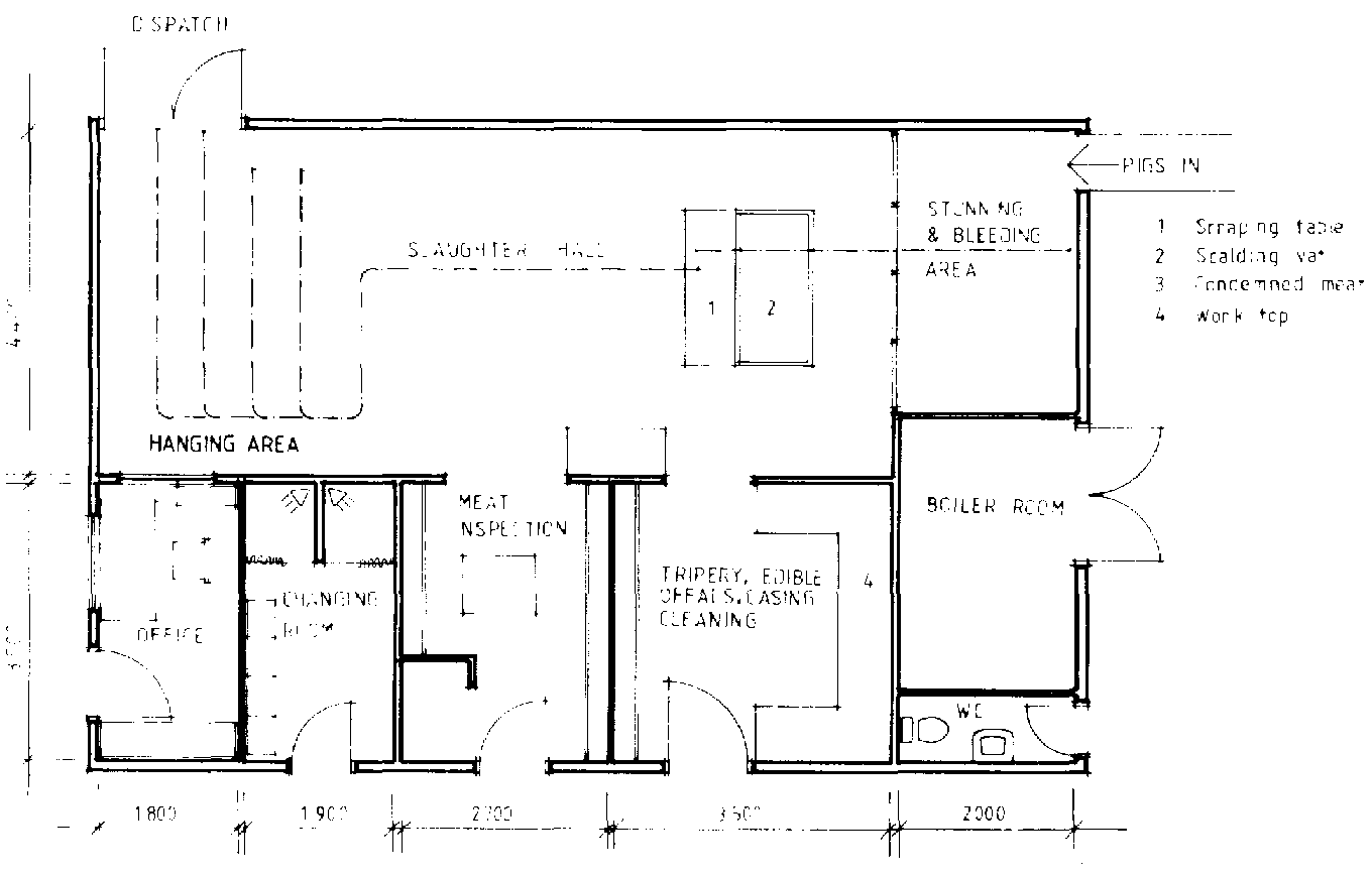 Out of consideration for the Muslim population, pigs should be handled separately in a slaughterhouse designed and used only for that purpose. Reasons other than religious also make it desirable to separate pig slaughtering. The steam from the scalding vats creates adverse conditions for setting of meat and the scurf accummulated from scraping pig carcasses is heavily contaminated with meat spoilage organisms. Pig slaughterhouse designs follow the same basic pattern as those for cattle, with provision for the separation of clean and dirty activities. The gallows and rails need to be 3.9m above floor level in the bleeding area and 2.5m in the slaughterhall. A water boiler to supply the scaldingvat with water of about 80°C will be required.
