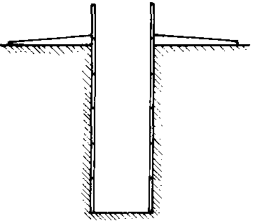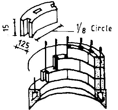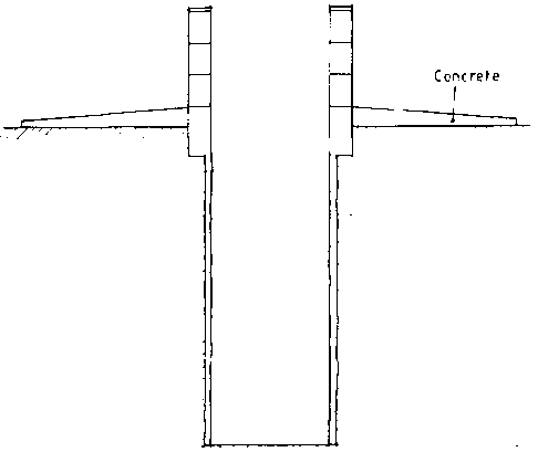 With either type of casing, by digging soil out from under the bottom of the casing, the whole structure will be allowed to settle. When the top of the well casing has reached the surface of the surrounding soil another section is added to the top. Thereafter digging is repeated until another section can be added on to the well at ground level, and so on until a satisfactory depth has been reached. The blocks must be tied together with vertical reinforcing rods to ensure that the casing sinks as a single unit.