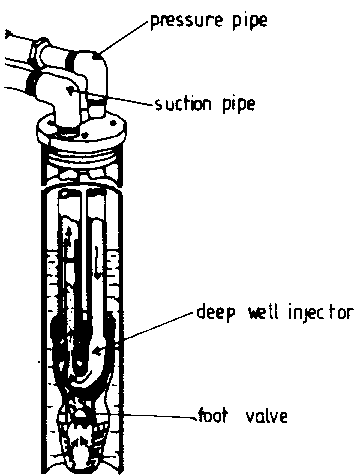 A deep-well jet pump will have the ejector installed below the low-water level in the well. Two pipes of different dimensions connect it to the pump which may be located at the top of the well or even some distance to one side. The smaller of the two pipes carries water to the ejector, while the larger one delivers water to the pump housing where most is discharged but some is returned to the ejector. These deep-well jet pumps are suitable for wells in which the water level drops to 30m. The correct ejector for maximum efficiency is chosen on the basis of the lowest expected water level in the well. (Figure 14.16).