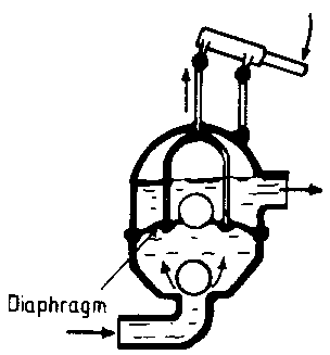 Diaphragm pumps have a piston and cylinder thatare replaced with a diaphragm. As there are no sliding parts to wear, these pumps are suitable for pumping muddy water or high moisture slurries such as the waste from a biogas generator. See Figure 14.17. These pumps may be either hand or power operated.