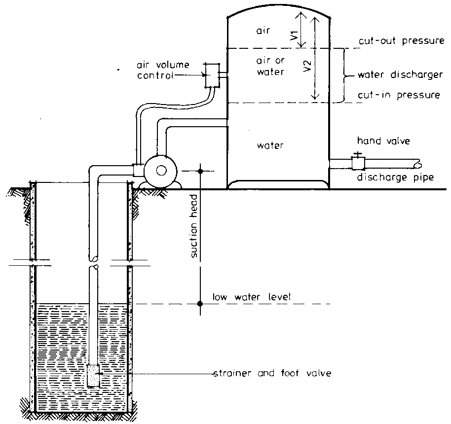 These systems consist of an enclosed tank combined with an automatic pressure switch which turns the pump motor on when tank pressure drops to a preset level. As the tank is approximately half full of air, several litres of water can be pumped into the tank before the air is compressed and the stock cut-off pressure is reached. The amount of water pumped into the tank can then be used as required before the pump needs to operate again. There are several advantages to the hydropneumatic system: