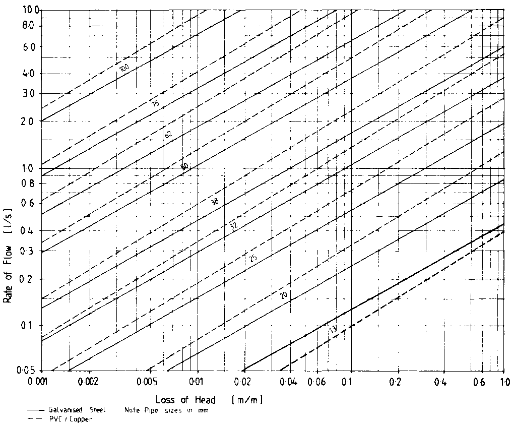 The length is directly proportional to the friction head in pipes. Figure 14.20 gives the loss of head for both smooth and rough pipes of several sizes and for a range of flow rates.
