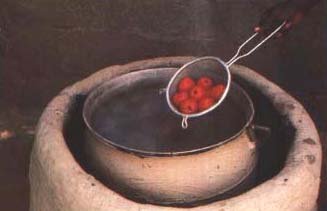 19. They are plunged immediately into cold water for a few minutes. Immersion in cold water after the boiling water helps to loosen the skin.