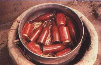 61. Once the bottles are capped, they are sterilized in a pot, just as with the jars of peeled tomatoes, with straw, a big stone to hold them down, and water which will be boiled for 45 minutes.