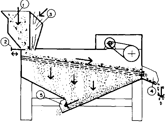 Diagram of a clodder: 1 Grain entry; 2 Adjustment; 3 Suction; 4 Impurities exit; 5 Grain exit.