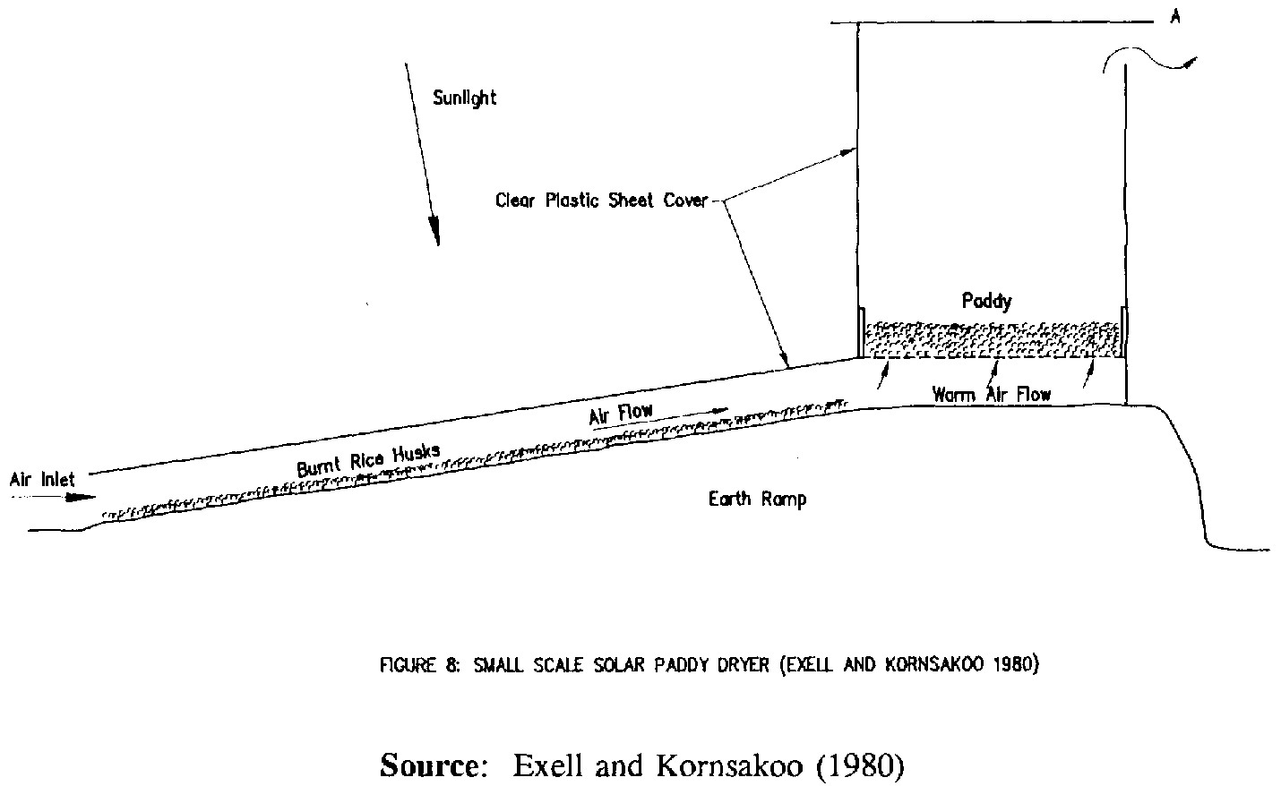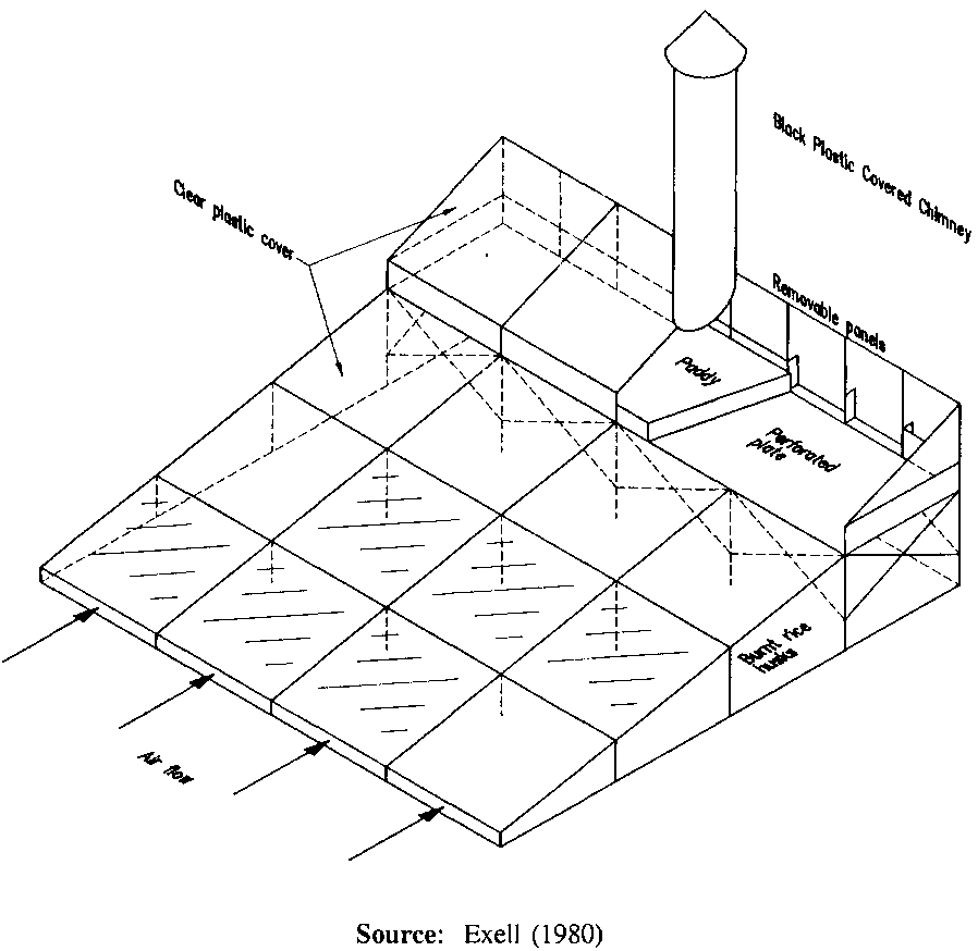 The solar chimney provides a column of warm air that increases the thermal draught of air through the dryer. It is made of a bamboo frame covered with black plastic sheet. In Thailand paddy was dried from 20% moisture to 13% moisture in 1-2 days and the rice quality was appreciably greater than that from sun dried paddy. A disadvantage of the dryer is its high structural profile which poses stability problems in windy conditions, and the need to replace the plastic sheet every 1-2 years. A smaller (100 kg capacity) and simpler version of this type of dryer has also been developed (Exell & Kornsakoo 1978; Oosthuizen & Sheriff 1988) as shown in Figure 5.8 (see Figure 5.8. Small scale Solar Paddy Dryer.).