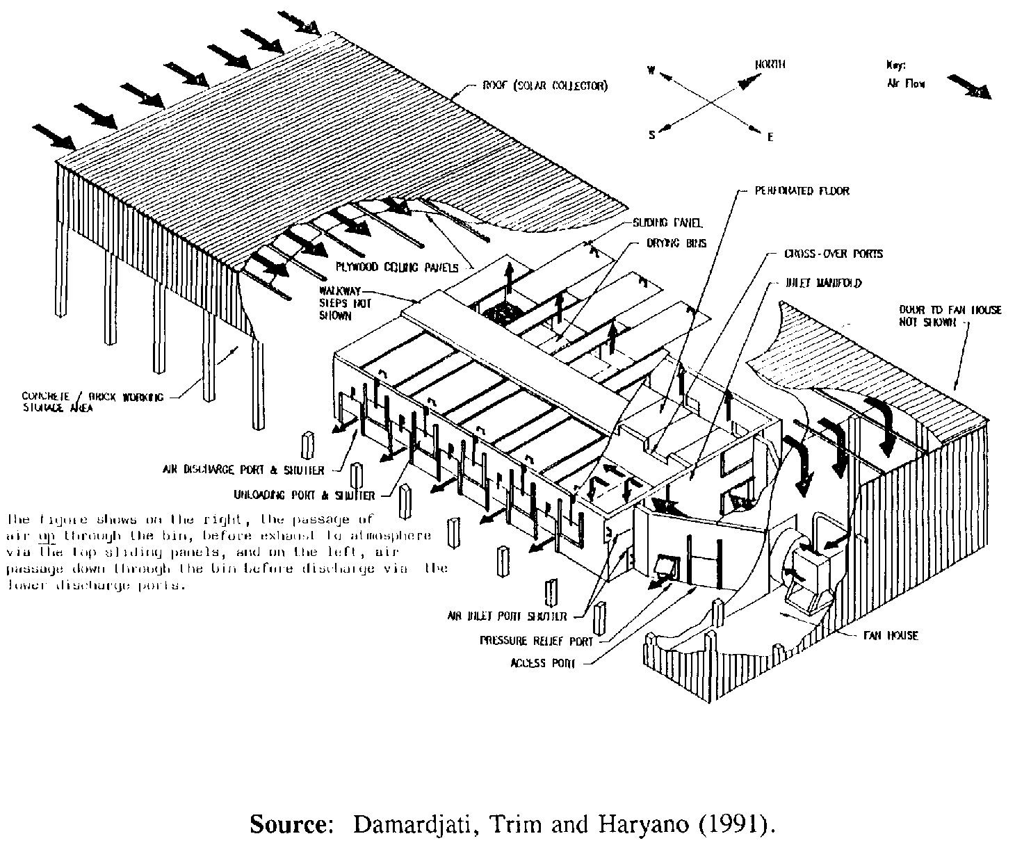 Research and performance studies on forced convection solar dryers have been reported by Bose (1978), Muthuveerappan et al. (1978) and Soponronnarit et al. (1986). Damardjati et al. (1991) have described the performance in Indonesia of a 10 tonne/day paddy dryer (Figure 5.10. Forced Convection Solar Paddy Dryer.) that incorporated a 225 m2 roof-type collector together with a moisture extraction unit (MEW, see below). Heat output from the collector averaged 60 kW over daylight hours and that from the MEU 35 kW with a mean daily elevation in air temperature of 7-9°C.