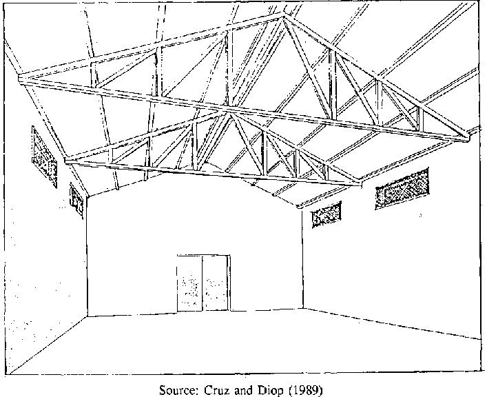 Roof frames made of wood or bamboo are only suitable for warehouses not more than 4 or 5 metres wide. The wood used must be well dried and treated with a preservative.