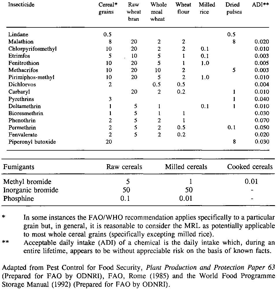 The chemical compounds, including both fumigants and contact insecticides, which are approved by FAD/WHO for use on food grains to control storage insects, are regularly reviewed. Their safety in use, for pest control operators and food-grain users, is carefully considered before approval is given and that approval may be withdrawn if new circumstances indicate the need for the exclusion of a particular compound. In general, the contact insecticides that are approved for use are compounds of relatively low mammalian toxicity, which are considered to be non-hazardous when applied at prescribed dilution rates for the purposes indicated. They are also relatively safer to handle than many of the pesticides quite commonly approved and widely used for preharvest pest control. Nevertheless, transportation and handling of the insecticide concentrates are hazardous. These hazards and the required precautions will be discussed further at the end of this section. At the outset, however, Tables 8.5 (see Table 8.5. Acute mammalian toxicities (LD50 - mg/kg body weight) for contact insecticides currently of use in stored-Brain insect control.) and 8.6 (see Table 8.6. Maximum residue limits (MRL) and acceptable daily intake levels (ADI) (mg/kg or ppm) recommended by FAD/WHO as at April 1992.) may be consulted for relevant data on mammalian toxicity, for a broad range of contact insecticides which are or have been used in the control of storage insects, and for the limits recommended by FAD/WHO for chemical residues, from contact insecticides and fumigants, in grain and grain products. It should be noted, in passing, that there is no acceptable residue for the insecticide DDT, which remains available in many developing countries but is no longer recommended for use in stored-grain pest control. Lindane, which is still of some use, is given a very low residue limit (0.5 ppm). This serves to preclude or discourage application to grains for export to countries which object to its use. It should also be noted that the limits for fumigant residues broadly represent the maximum levels that should be expected if fumigation treatments are properly done. This applies also to residues of inorganic bromide and these have recently been declared of no toxicological concern by the U.S.A's Environmental Protection Agency and by the British Government. The very low limit for phosphine in Table 8.6 reflects the generally negligible permanent residue which remains after the use of this fumigant.